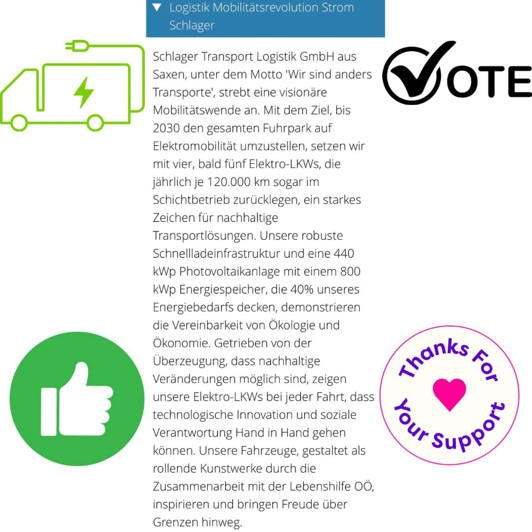 Wir sind mit unserem Projekt "Logistik Mobilitätsrevolution Strom Schlager" nominiert!