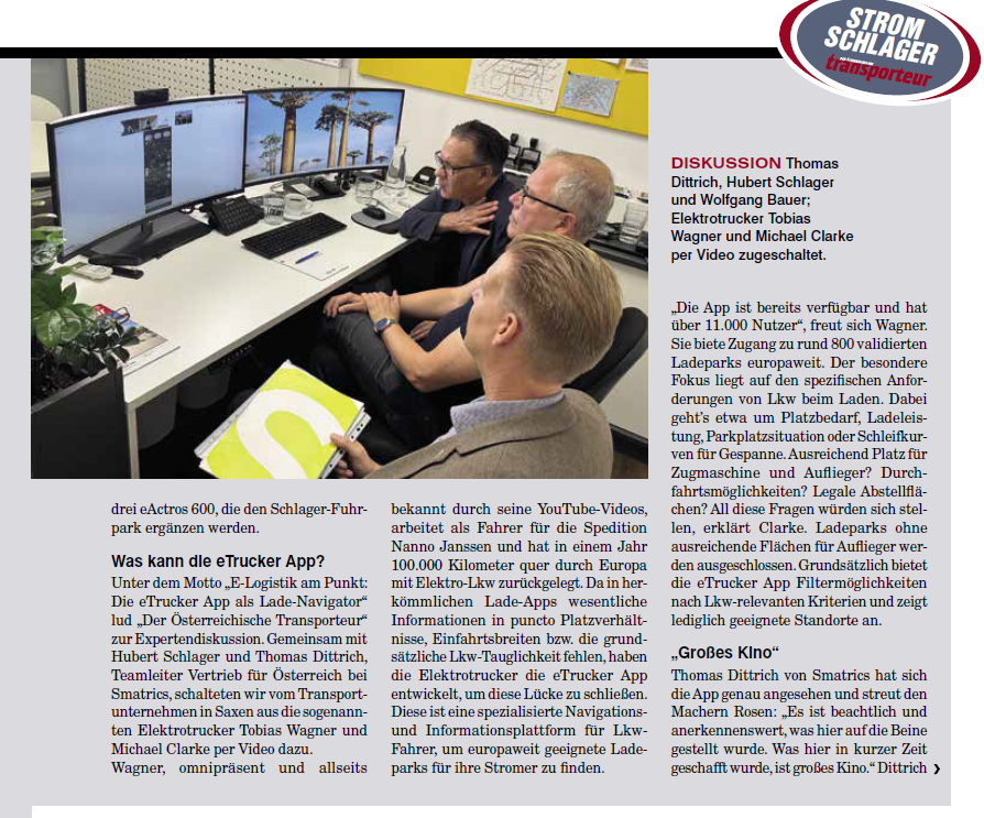 Gemeinsam mit Der Österreichische Transporteur-Redakteur Wolfgang Bauer haben wir diskutiert, wie digitale Tools den Alltag im E-Lkw-Betrieb verändern – von der intelligenten Routenplanung über Community-Feedback bis hin zur Ladeplatzbewertung.